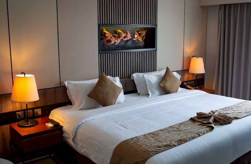 • A neatly arranged hotel room with a queen-sized bed, pillows, bedside tables with lamps, and a modern decor theme.