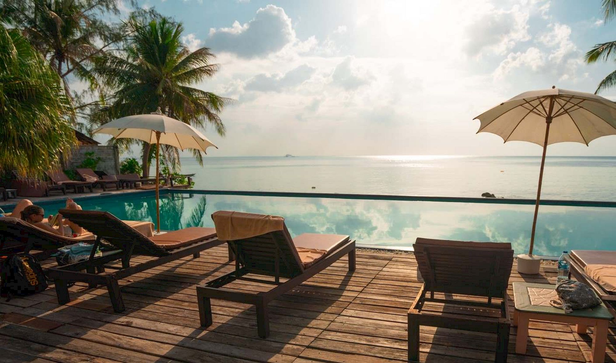 A tropical poolside scene with lounge chairs and umbrellas, overlooking a calm sea under a partly cloudy sky.
