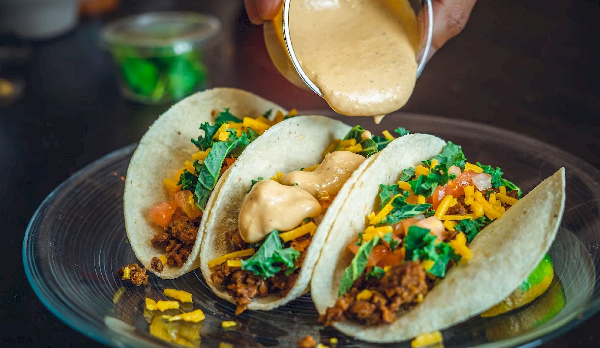 Three tacos filled with ground meat, shredded cheese, lettuce, and tomatoes, topped with sauce being poured over them on a plate.