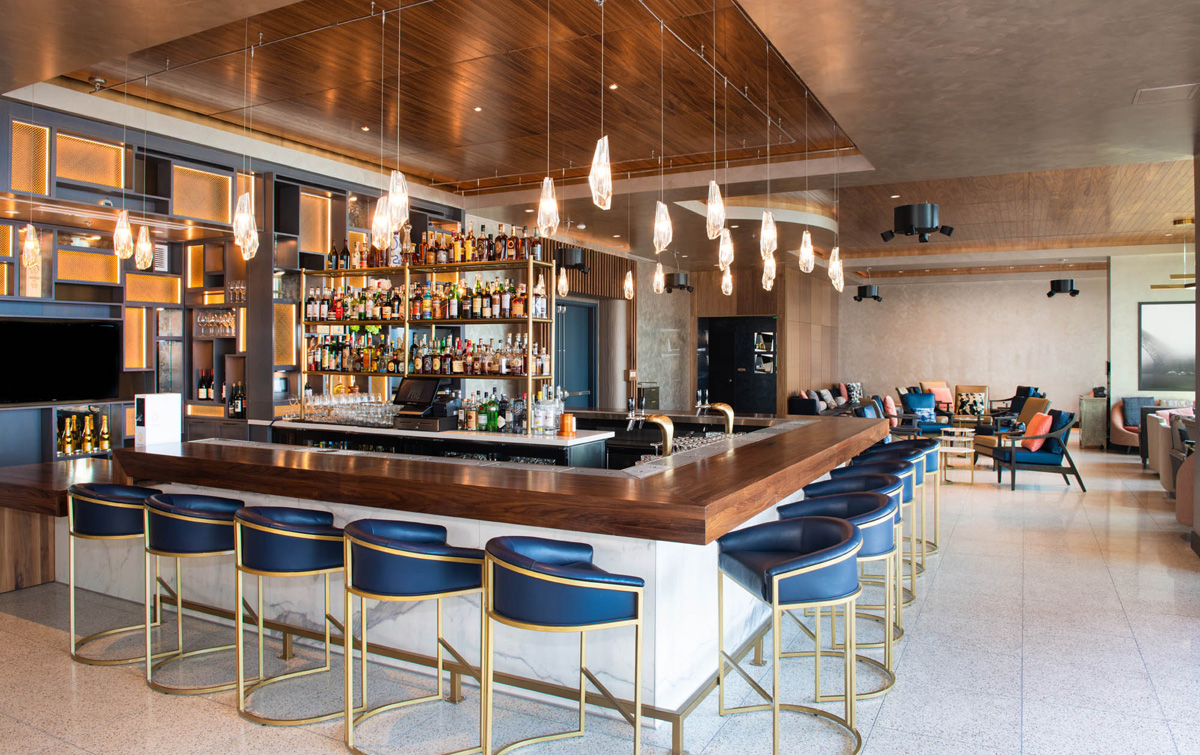 A modern bar with blue stools, a wooden counter, pendant lights, and shelves stocked with bottles. Bright and inviting atmosphere.
