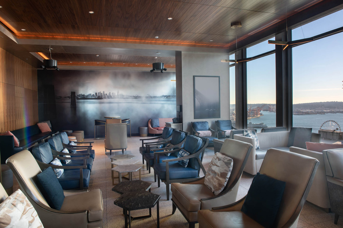 A modern rooftop terrace features seating and tables, overlooking a cityscape with tall buildings during twilight.
