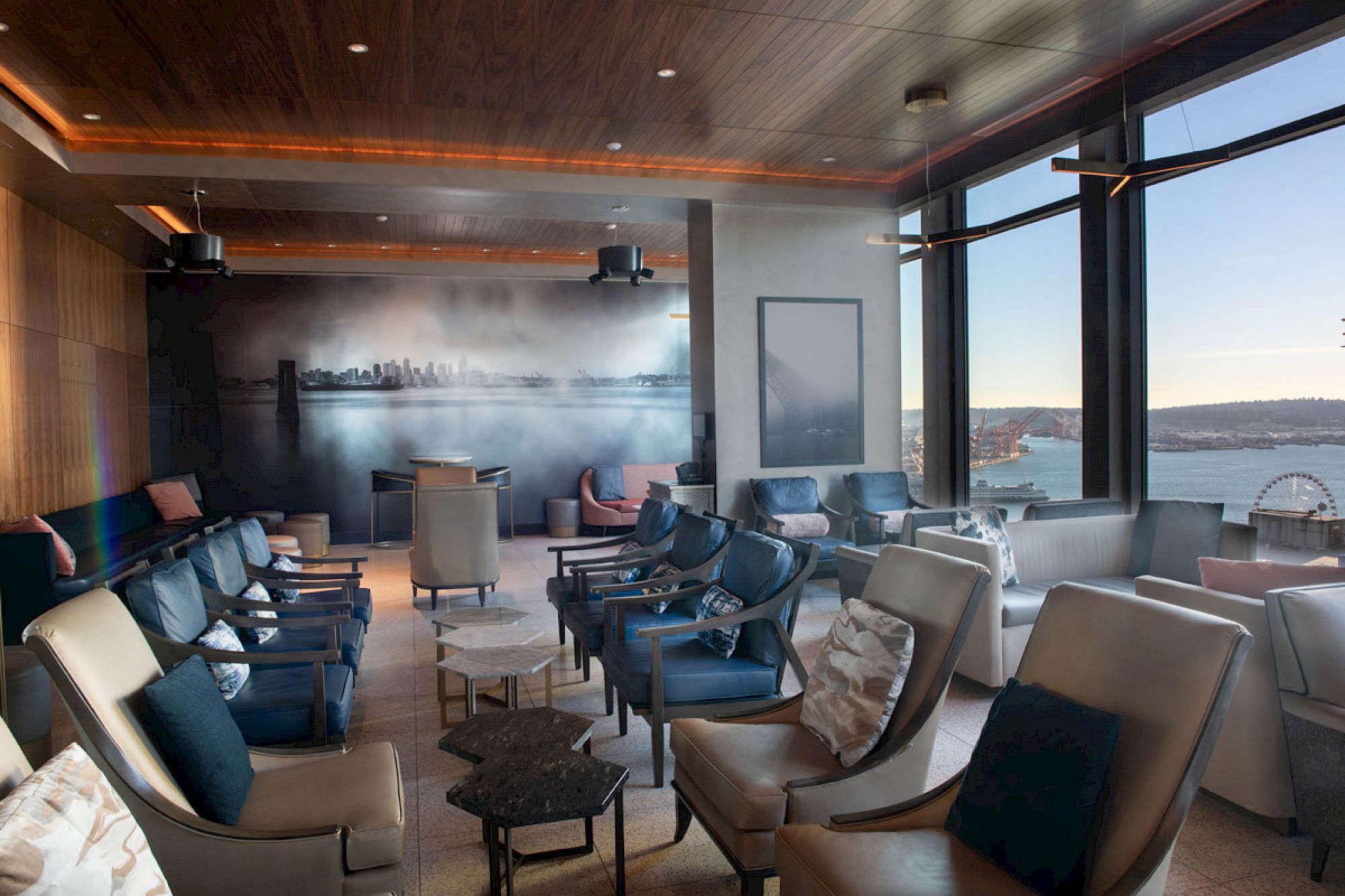 The image shows the Space Needle amidst the Seattle skyline, with various skyscrapers and buildings against a cloudy sky backdrop.