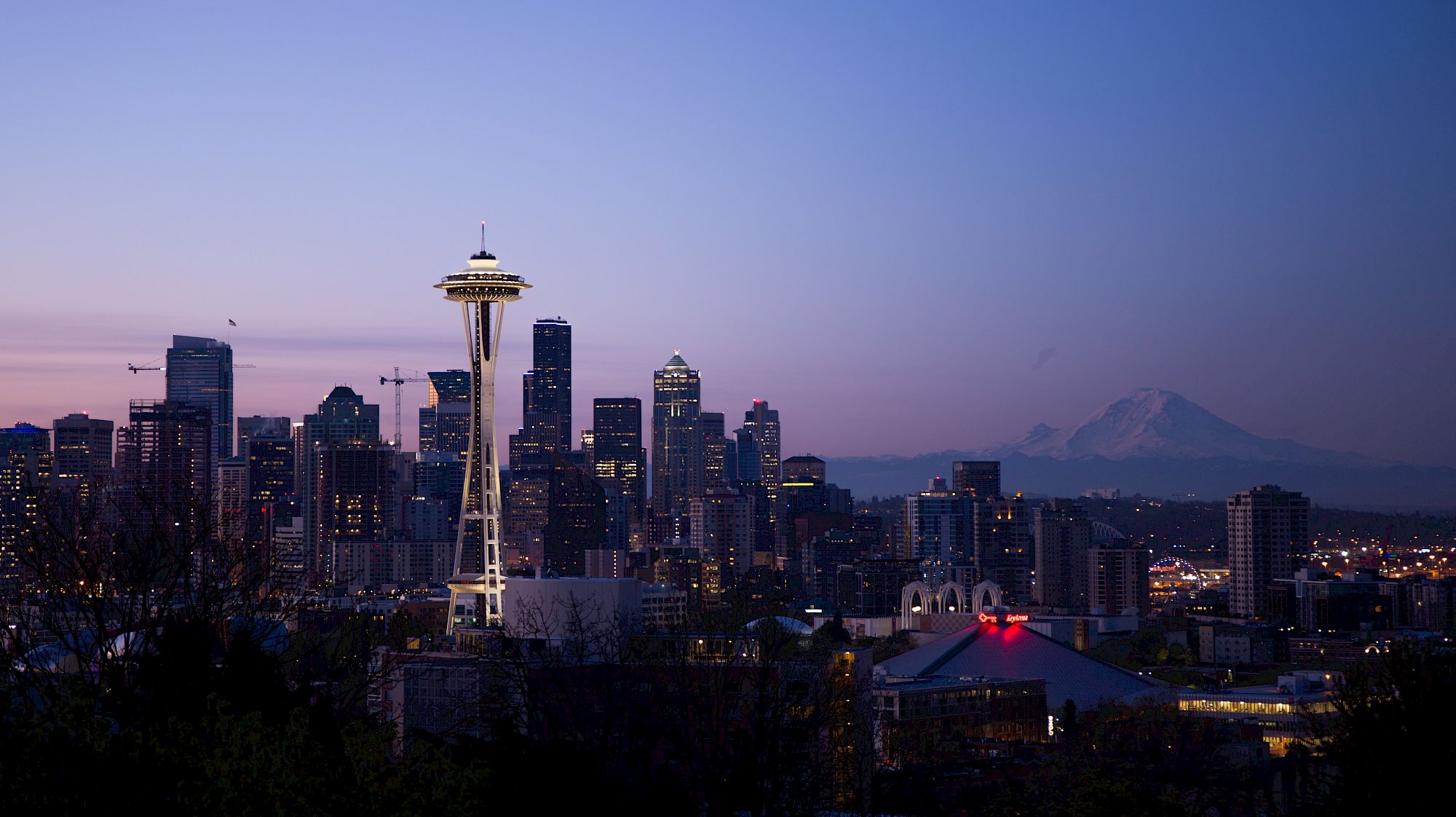 A cityscape at dusk featuring the Space Needle and Seattle skyline with a mountain in the background under a colorful sky.